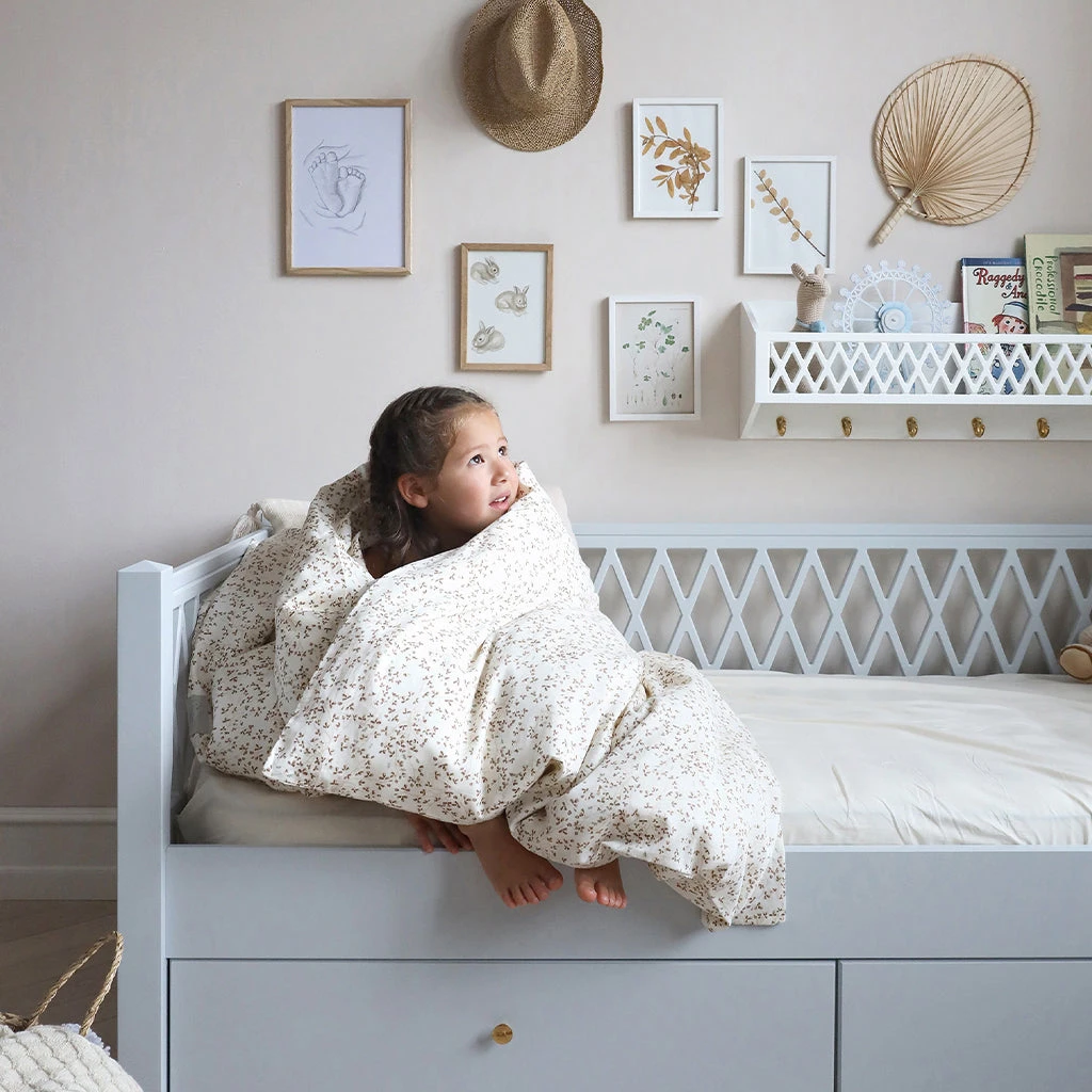 This Junior bedding set includes a duvet cover 100x140cm and a pillow case 40x45cm and comes in a matching fabric bag. Both are closed with a YKK zipper. Junior bedding in brown and white shades.