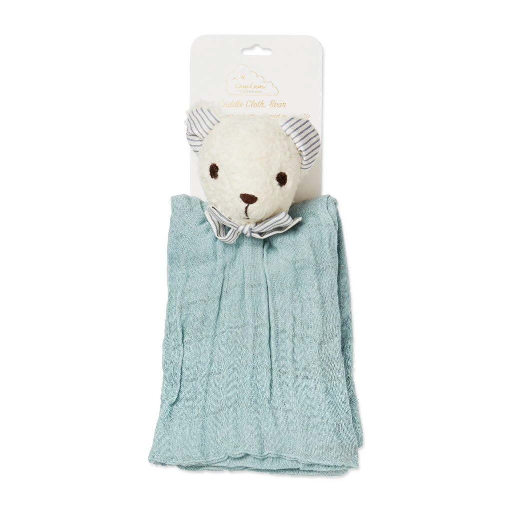 Soft cuddle cloth in organic muslin fabric with an adorable teddy bear.