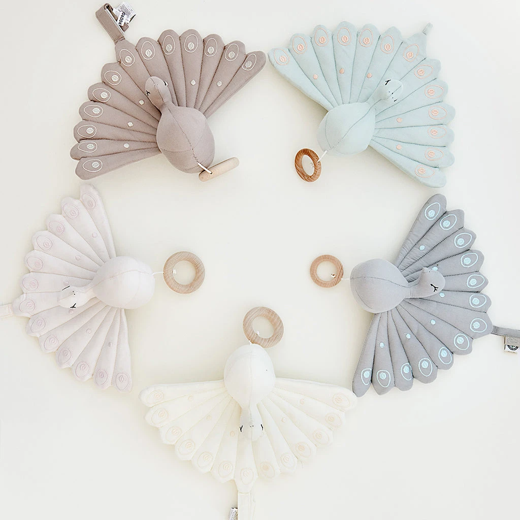 Decorative peacock music mobile with fine embroidery for the nursery, perfect for hanging above the cot or the changing table. Melody: ’Lullaby’ Comes in a nice box, which makes it a great gift.